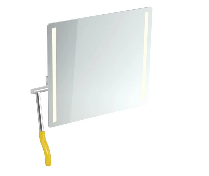 Verbundspiegel mit eingearbeitetem Splitterschutz, mit ergonomisch geformtem Griff aus Polyamid in ausgewählten HEWI Farben, rechteckig, Breite 725 mm, Höhe 741 mm, mit integrierter LED-Beleuchtung rechts und links, Hebel links, Dieses Produkt enthält eine Lichtquelle der Energieeffizienzklasse G, CE- und UKCA-Kennzeichnung nach EMV 2014/30/EU, Schutzklasse II, Schutzgrad IP 44.
