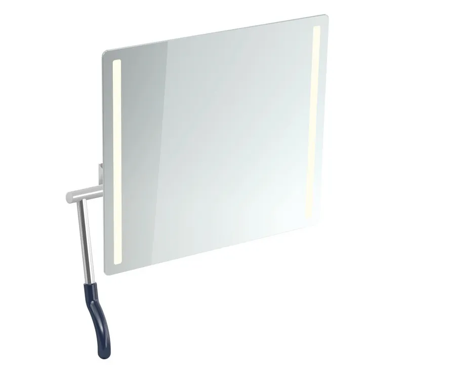 Verbundspiegel mit eingearbeitetem Splitterschutz, mit ergonomisch geformtem Griff aus Polyamid in ausgewählten HEWI Farben, rechteckig, Breite 725 mm, Höhe 741 mm, mit integrierter LED-Beleuchtung rechts und links, Hebel links, Dieses Produkt enthält eine Lichtquelle der Energieeffizienzklasse G, CE- und UKCA-Kennzeichnung nach EMV 2014/30/EU, Schutzklasse II, Schutzgrad IP 44.