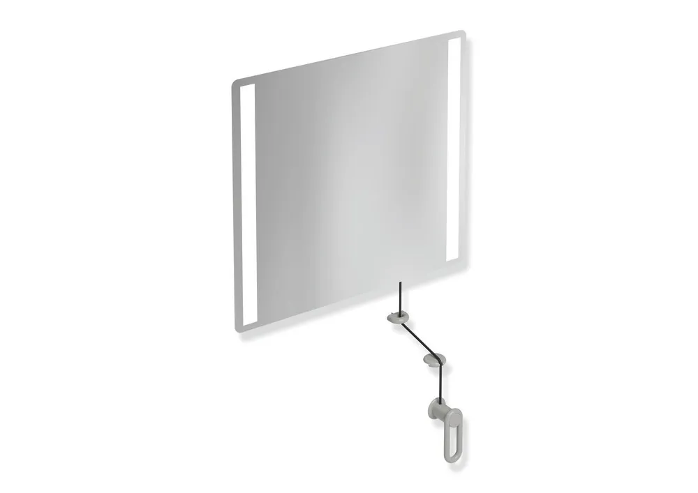 rechteckiger beleuchteter Verbundspiegel mit geschliffenen Kanten, eingearbeitetem Splitterschutz und integrierter LED-Beleuchtung seitlich rechts und links, mit Seilumlenkung und zwei hochwertigen LED-Leuchtprofilen aus Aluminium, rückseitig am Spiegel befestigt. Langlebige LED in Lichtfarbe Neutralweiß, ca. 4000 Kelvin, Gesamtleistung ca. 9,6 Watt. LED und Vorschaltgerät geschützt, Schutzklasse II, Schutzgrad IP 44. Spiegel 599 mm breit, 540 mm hoch und 6 mm stark aus Verbundglas, Halteelemente und Kurbel aus hochglänzendem Polyamid nach HEWI Farbtabelle. Dieses Produkt enthält eine Lichtquelle der Energieeffizienzklasse G. CE- und UKCA-Kennzeichnung nach EMV 2014/30/EU.