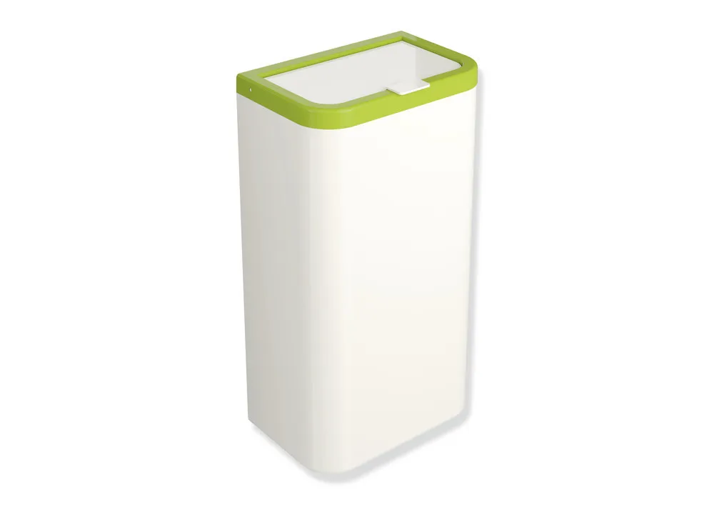 Korpus und Deckel aus hochglänzendem Polyamid in der HEWI Farbe 99 (Reinweiß), Rahmenelement aus hochglänzendem Polyamid, Fassungsvermögen ca. 25 l, Breite 281 mm, Höhe 505 mm, Tiefe 181 mm, Wandmontage.