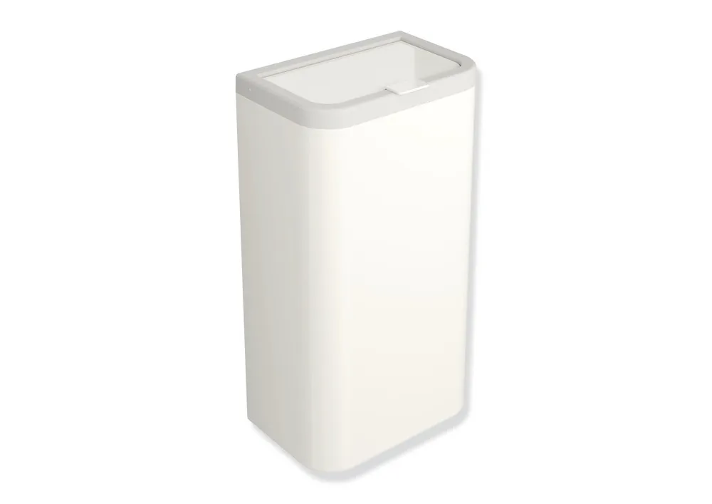 Korpus und Deckel aus hochglänzendem Polyamid in der HEWI Farbe 99 (Reinweiß), Rahmenelement aus hochwertigem, mattem Polyamid, Fassungsvermögen ca. 25 l, Breite 281 mm, Höhe 505 mm, Tiefe 181 mm, Wandmontage.