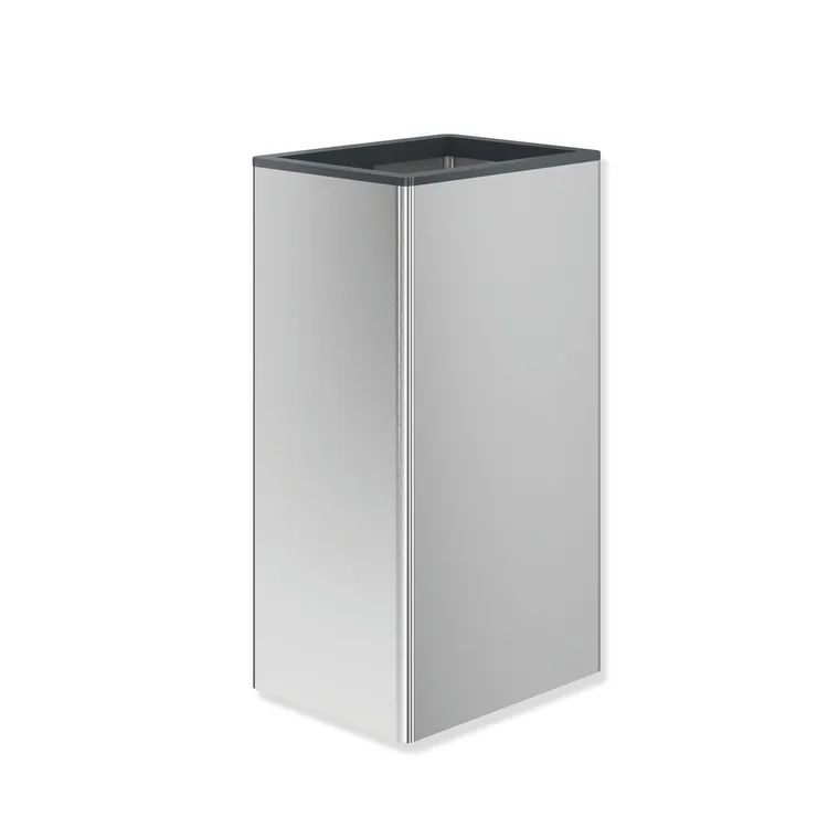 Mehr anzeigen kubischer Grundkörper mit eingerücktem Wandsockel, dient als Abfallbehälter für benutzte Papierhandtücher, Fassungsvermögen ca. 60 l, 340 mm breit, 620 mm hoch und 260 mm tief, Wandsockel 15 mm tief, aus hochwertigem Edelstahl, Oberfläche matt geschliffen, Einwurföffnung aus hochwertigem Kunststoff in den HEWI Farben 90 (Tiefschwarz), 92 (Anthrazitgrau), 98 (Signalweiß) oder 99 (Reinweiß), inklusive korrosionsfreiem Befestigungsmaterial.