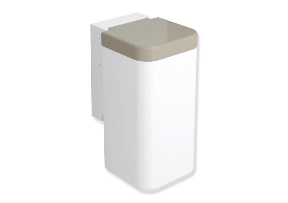 Korpus und Wandhalterung aus hochglänzendem Polyamid in der HEWI Farbe 98 (Signalweiß), Deckel aus hochglänzendem Polyamid, Fassungsvermögen ca. 6 l, Höhe 310 mm, Tiefe 198 mm, Breite 161 mm, Wandmontage.
