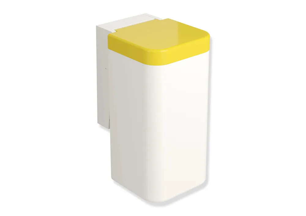 Korpus und Wandhalterung aus hochglänzendem Polyamid in der HEWI Farbe 99 (Reinweiß), Deckel aus hochglänzendem Polyamid, Fassungsvermögen ca. 6 l, Höhe 310 mm, Tiefe 198 mm, Breite 161 mm, Wandmontage.