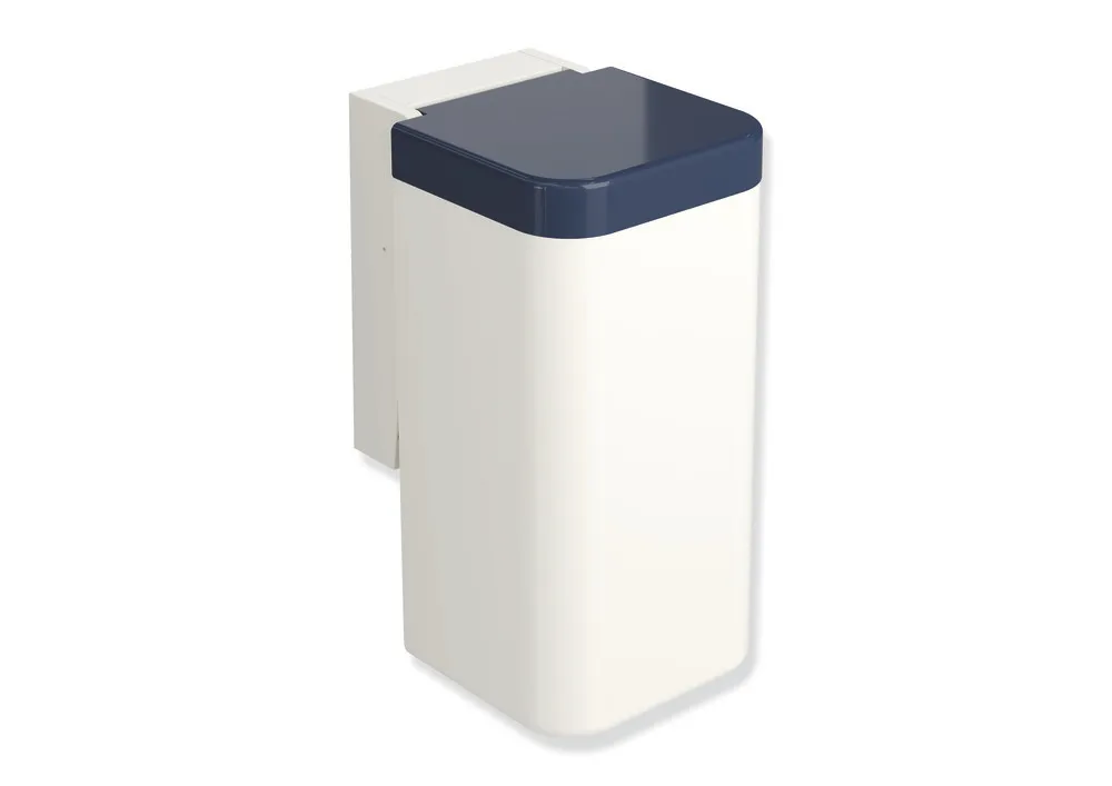 Korpus und Wandhalterung aus hochglänzendem Polyamid in der HEWI Farbe 99 (Reinweiß), Deckel aus hochglänzendem Polyamid, Fassungsvermögen ca. 6 l, Höhe 310 mm, Tiefe 198 mm, Breite 161 mm, Wandmontage.