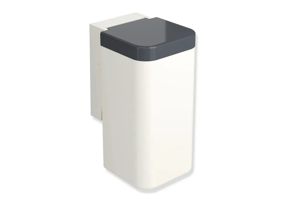 Korpus und Wandhalterung aus hochglänzendem Polyamid in der HEWI Farbe 99 (Reinweiß), Deckel aus hochglänzendem Polyamid, Fassungsvermögen ca. 6 l, Höhe 310 mm, Tiefe 198 mm, Breite 161 mm, Wandmontage.