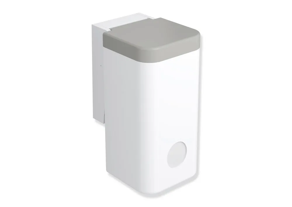 Korpus und Wandhalterung aus hochglänzendem Polyamid in der HEWI Farbe 98 (Signalweiß), Deckel aus hochwertigem, mattem Polyamid, Fassungsvermögen ca. 6 l, Höhe 310 mm, Tiefe 198 mm, Breite 161 mm, Wandmontage.