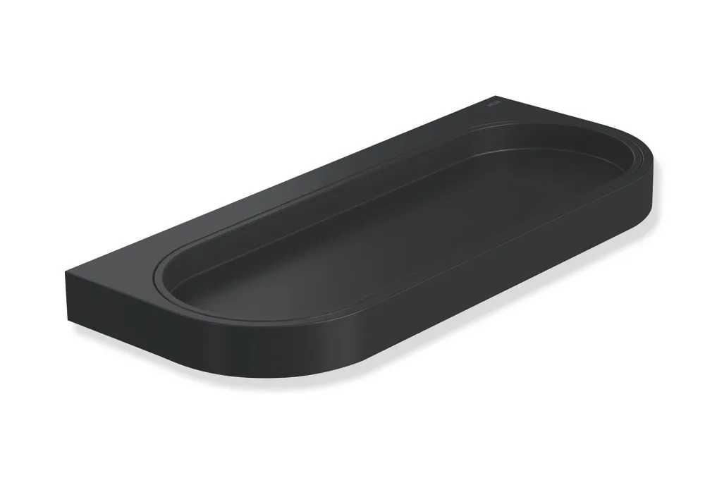Halter aus Metall, pulverbeschichtet in der HEWI Farbe CV (Schwarz tiefmatt) oder in der HEWI Farbe AS (Weiß tiefmatt), ovale Ablage aus mattem Polyamid in Farbe des Halters, 250 mm breit, 20 mm hoch, 106 mm tief, zur Wandmontage.