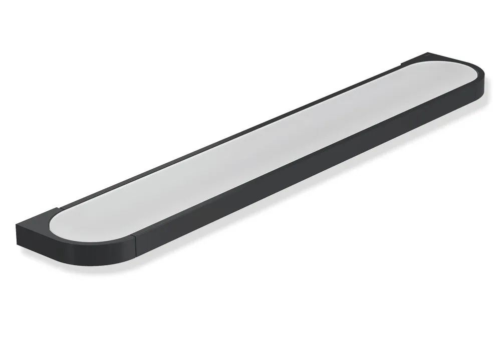 Halter aus Metall, pulverbeschichtet in der HEWI Farbe DC (Schwarz tiefmatt) oder in der HEWI Farbe DX (Weiß tiefmatt), mit hochwertiger, satinierter Glasplatte, 600 mm breit, 20 mm hoch, 100 mm tief, zur Wandmontage.