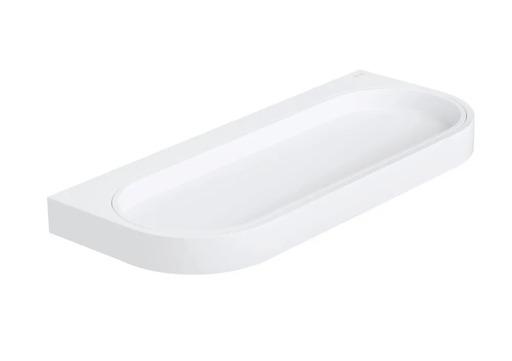 Halter aus Metall, pulverbeschichtet in der HEWI Farbe CV (Schwarz tiefmatt) oder in der HEWI Farbe AS (Weiß tiefmatt), ovale Ablage aus mattem Polyamid in Farbe des Halters, 250 mm breit, 20 mm hoch, 106 mm tief, zur Wandmontage.