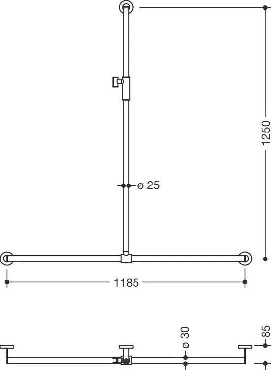 Mehr anzeigen Edelstahl, pulverbeschichtet, mit stufenlos verstellbarem, magnetischem Brausehalter aus Edelstahl in Farbe der Brausestange, senkrechte Länge 1250 mm, waagerechte Länge 1185 mm, senkrechter Stangendurchmesser 25 mm, waagerechter Stangendurchmesser 30 mm, getestet bis 200 kg bei Verwendung mit HEWI Befestigungsmaterial, empfohlenes maximales Gewicht des Anwenders: 150 kg.