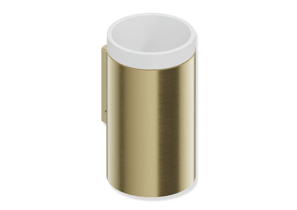Halter aus hochwertigem Edelstahl, PVD beschichtet, Becher aus weiß mattem Polyamid.