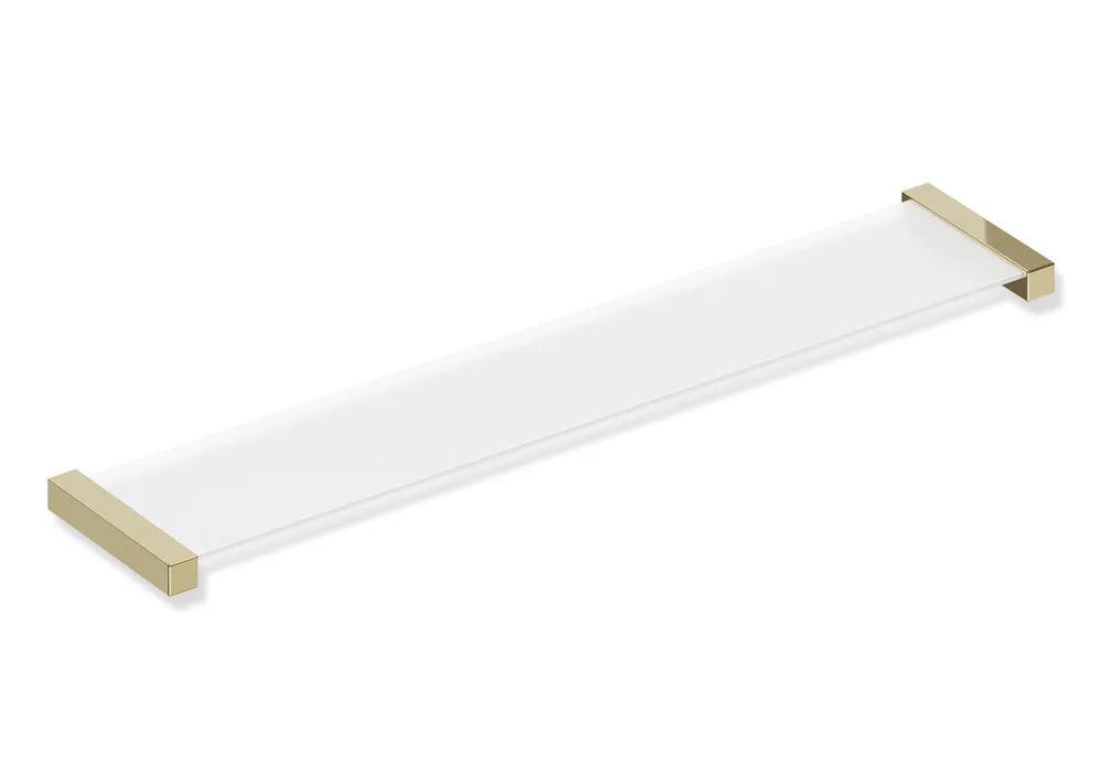 Edelstahl, PVD beschichtet, Ablagefläche aus ESG-Glas (4 mm), von der Unterseite satiniert, Breite 616 mm, Höhe 20 mm, Tiefe 122 mm, zur Wandmontage.