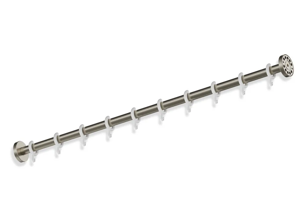 Mehr anzeigen Edelstahl, PVD beschichtet, Länge auf Maß gefertigt von 400 mm bis 1500 mm, kürzbar, Durchmesser 25 mm, mit entsprechender Anzahl Vorhangringe aus weißem POM.