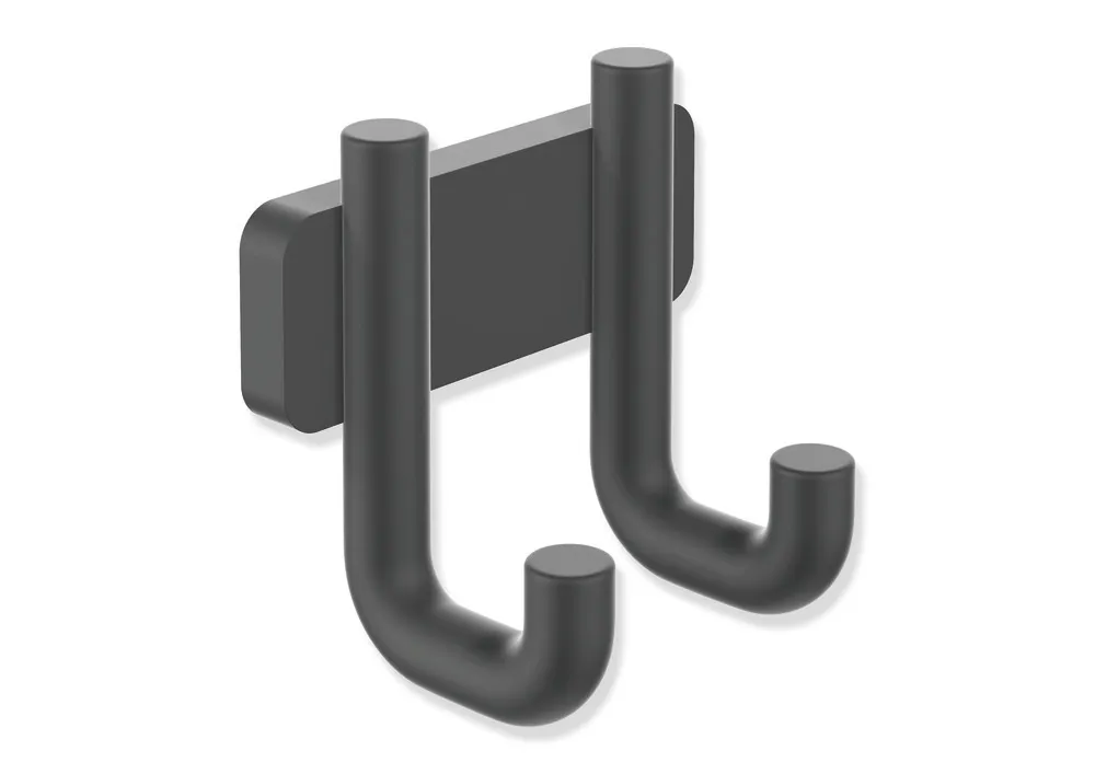 - Doppelhaken mit zwei rechtwinklig gebogenen Haken im Rundrohrdesign auf einer flachen Sockelleiste mit abgerundeten Ecken
