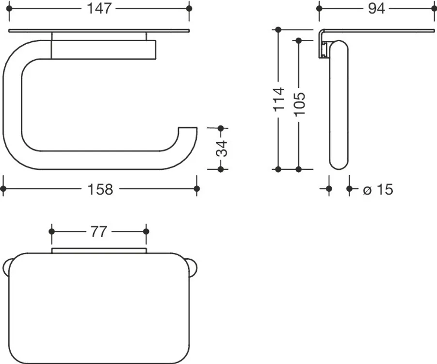 Edelstahl, matt geschliffen, Breite 158 mm, Höhe 114 mm, Durchmesser 15 mm, Ablage 147 mm breit, 94 mm tief.