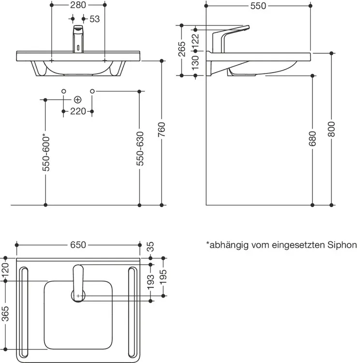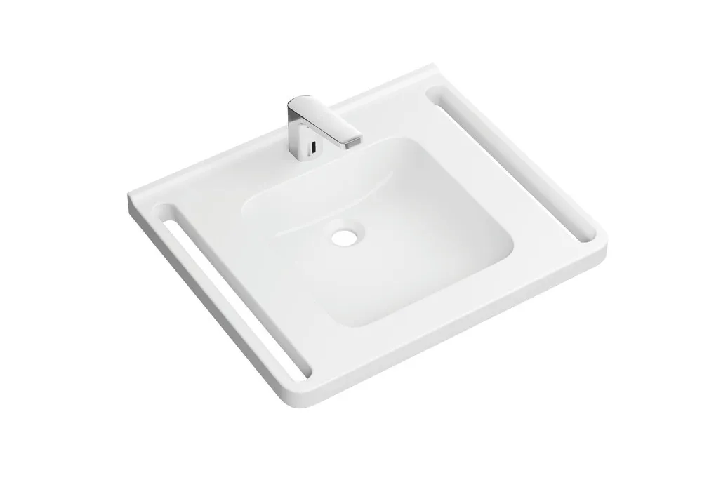 Mehr anzeigen bestehend aus Waschtisch 950.11.161 aus Mineralguss mit porenfreier Oberfläche, alpinweiß, integrierte ergonomische Haltemöglichkeit seitlich, als Handtuchhalter nutzbar, unterfahrbar nach DIN 18040 und ÖNORM B1600/1601, 650 mm breit und 550 mm tief, für Einlocharmatur, ohne Überlauf, belastbar nach DIN EN 14688, CE-Kennzeichnung nach Bauprodukteverordnung Nr. 305/2011.