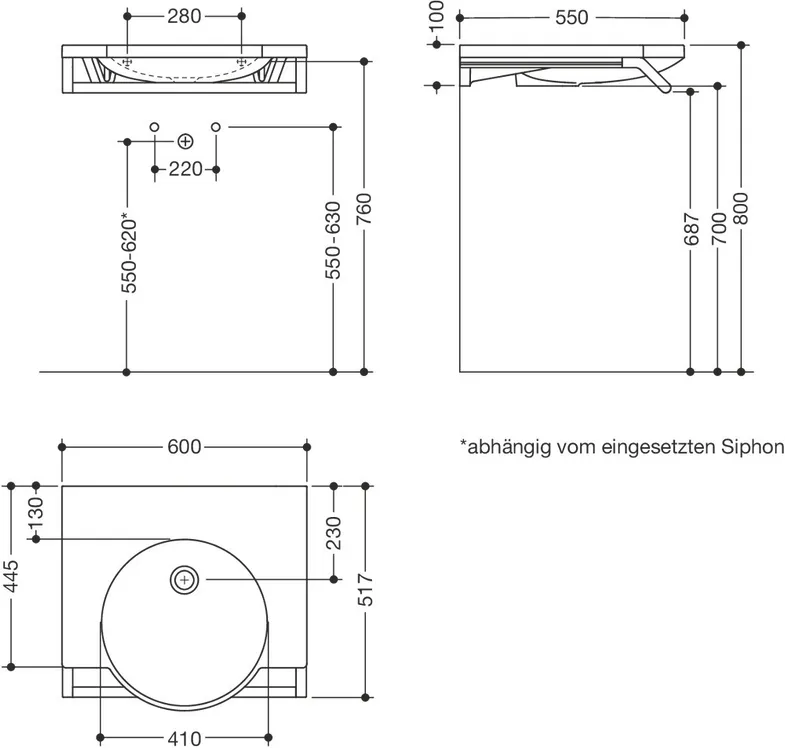 Waschtisch aus Mineralguss, alpinweiß, mit Ablagefläche und rundem Becken, Breite 600 mm, Tiefe 550 mm, Waschmuldentiefe 80 mm, ohne Überlauf, für wandgebundene Armaturen, unterfahrbar nach DIN 18040 und ÖNORM B1600/1601, belastbar nach DIN EN 14688, CE-Kennzeichnung nach Bauprodukteverordnung Nr. 305/2011.