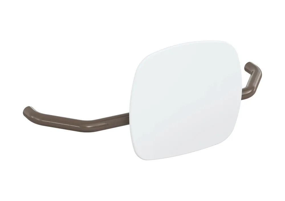 Mehr anzeigen Polyamid, hochglänzend, Lehne aus Kunststoff in HEWI Farbe 98 (Signalweiß), Breite 650 bis 750 mm, Tiefe 230 mm, Lehne 334 mm hoch und 370 mm breit, Stangendurchmesser 33 mm, Montage an Stützklappgriffen oder Wandstützgriffen mit Wandplatte, bauseits verstellbar.