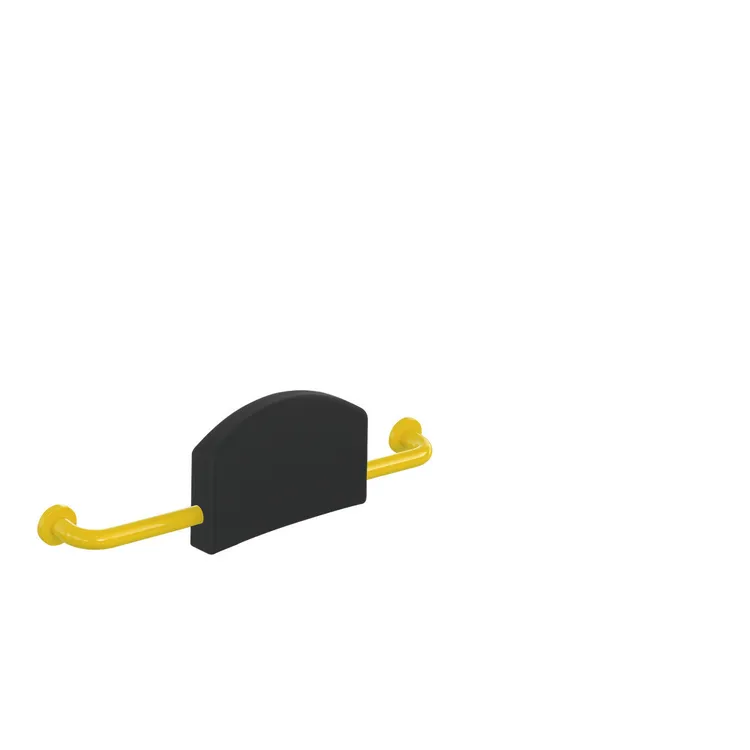 Mehr anzeigen gepolsterte Lehne mit beidseitig angebrachten, rechtwinklig gebogenen Stangen und Befestigungsrosetten, erfüllt die Anforderungen nach DIN 18040, mit durchgehendem, korrosionsgeschütztem Stahlkern, Achsmaß von 670 mm bis 730 mm bauseits verstellbar, 220 mm hoch und 150 mm tief, Rückenstütze 350 mm breit, Stangendurchmesser 33 mm, Rosettendurchmesser 70 mm, Rückenpolster aus schwarzem PUR, aus hochwertigem Polyamid nach HEWI Farbtabelle, Befestigungsmaterial BM 211 im Lieferumfang enthalten.