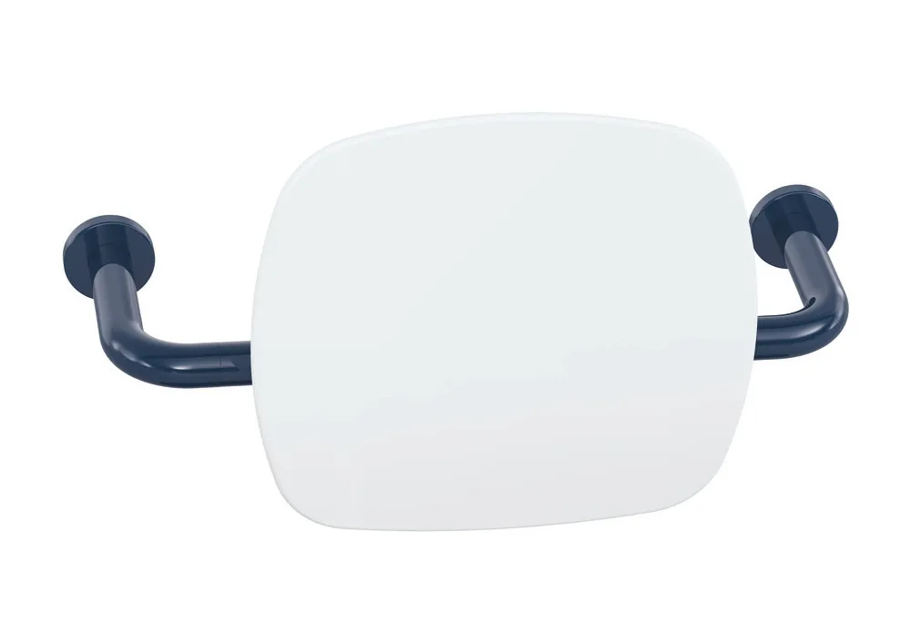 Mehr anzeigen Polyamid, hochglänzend, Lehne aus Kunststoff in HEWI Farbe 98 (Signalweiß), Breite 435 mm bis 535 mm, Tiefe 230 mm, Lehne 334 mm hoch und 370 mm breit, Stangendurchmesser 33 mm, Montage an der Wand mit Rosetten.