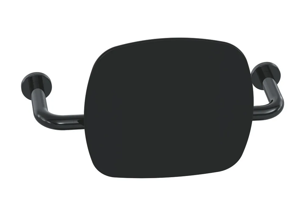 Polyamid, hochglänzend, Lehne aus Kunststoff in HEWI Farbe 90 (Tiefschwarz), Breite 435 mm bis 535 mm, Tiefe 230 mm, Lehne 334 mm hoch und 370 mm breit, Stangendurchmesser 33 mm, Montage an der Wand mit Rosetten.