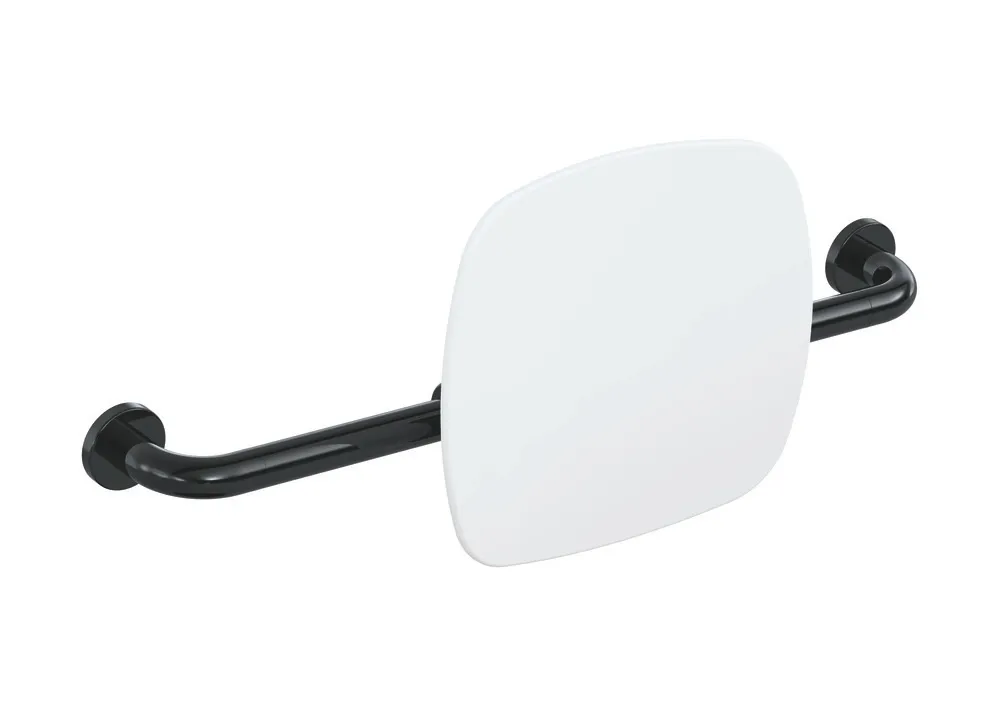Polyamid, hochglänzend, Lehne aus Kunststoff in HEWI Farbe 98 (Signalweiß), Breite 650 bis 750 mm, Tiefe 150 mm, Lehne 334 mm hoch und 370 mm breit, Stangendurchmesser 33 mm, Montage an der Wand mit Rosetten, erfüllt die Anforderungen nach DIN 18040 und ÖNORM B1600/1601.