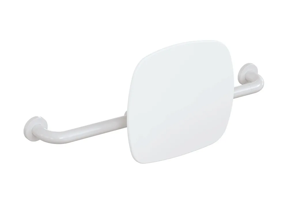 Polyamid, hochglänzend, Lehne aus Kunststoff in HEWI Farbe 98 (Signalweiß), Breite 650 bis 750 mm, Tiefe 150 mm, Lehne 334 mm hoch und 370 mm breit, Stangendurchmesser 33 mm, Montage an der Wand mit Rosetten, erfüllt die Anforderungen nach DIN 18040 und ÖNORM B1600/1601.