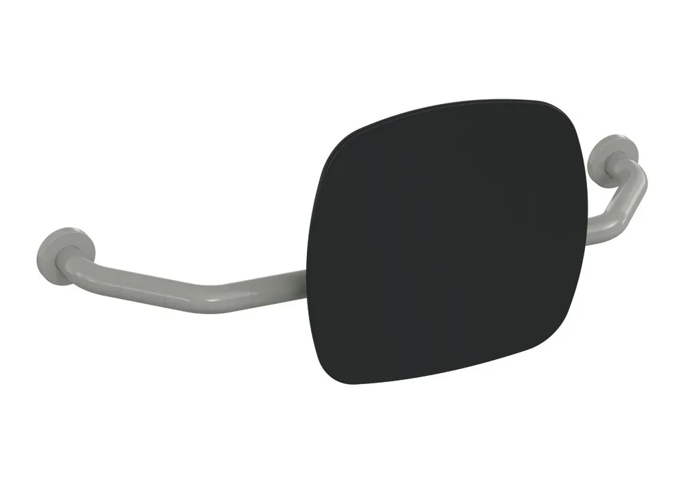 Polyamid, hochglänzend, Lehne aus Kunststoff in HEWI Farbe 90 (Tiefschwarz), Breite 650 bis 750 mm, Tiefe 230 mm, Lehne 334 mm hoch und 370 mm breit, Stangendurchmesser 33 mm, Montage an der Wand mit Rosetten.