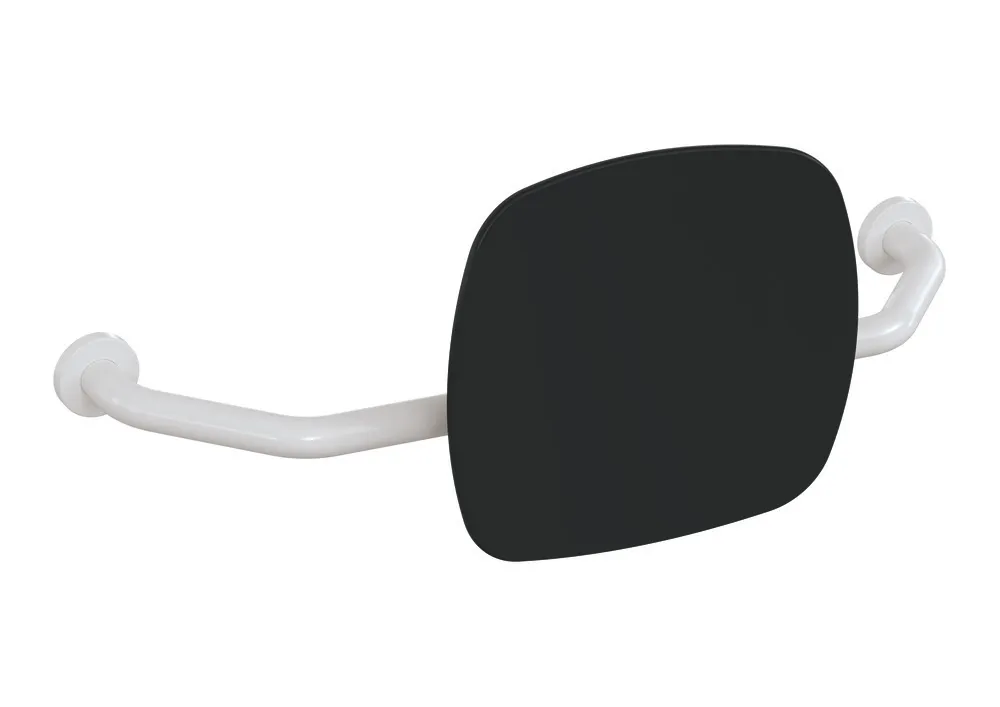 Mehr anzeigen Polyamid, hochglänzend, Lehne aus Kunststoff in HEWI Farbe 90 (Tiefschwarz), Breite 650 bis 750 mm, Tiefe 230 mm, Lehne 334 mm hoch und 370 mm breit, Stangendurchmesser 33 mm, Montage an der Wand mit Rosetten.