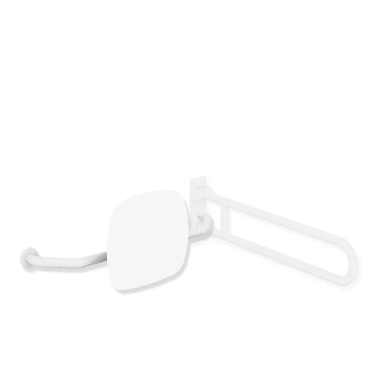 Mehr anzeigen Polyamid, hochglänzend, Lehne aus Kunststoff in HEWI Farbe 98 (Signalweiß), Breite 650 bis 750 mm, Tiefe 230 mm, Lehne 334 mm hoch und 370 mm breit, Stangendurchmesser 33 mm, einseitig Montage an der Wand mit Rosetten (rechts), einseitig Montage an Stützklappgriffen oder Wandstützgriffen mit Wandplatte (links).