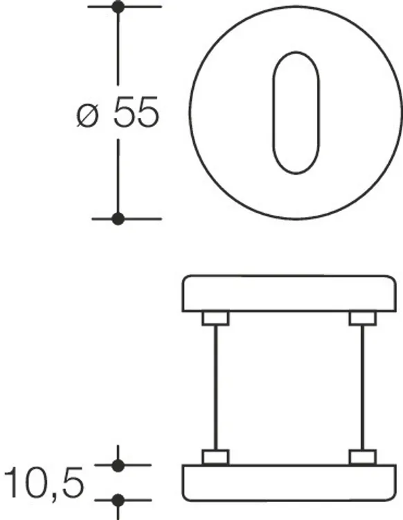 für Feuerschutztüren Rosettenunterkonstruktion in Polyamid-Edelstahlverbundbau, DIN links und DIN rechts verwendbar. Verdeckte, lockerungssichere Verschraubung mit M5 Edelstahlschrauben- und Hülsenschraubenkombination und in das Türblatt eintauchenden Stützzapfen.