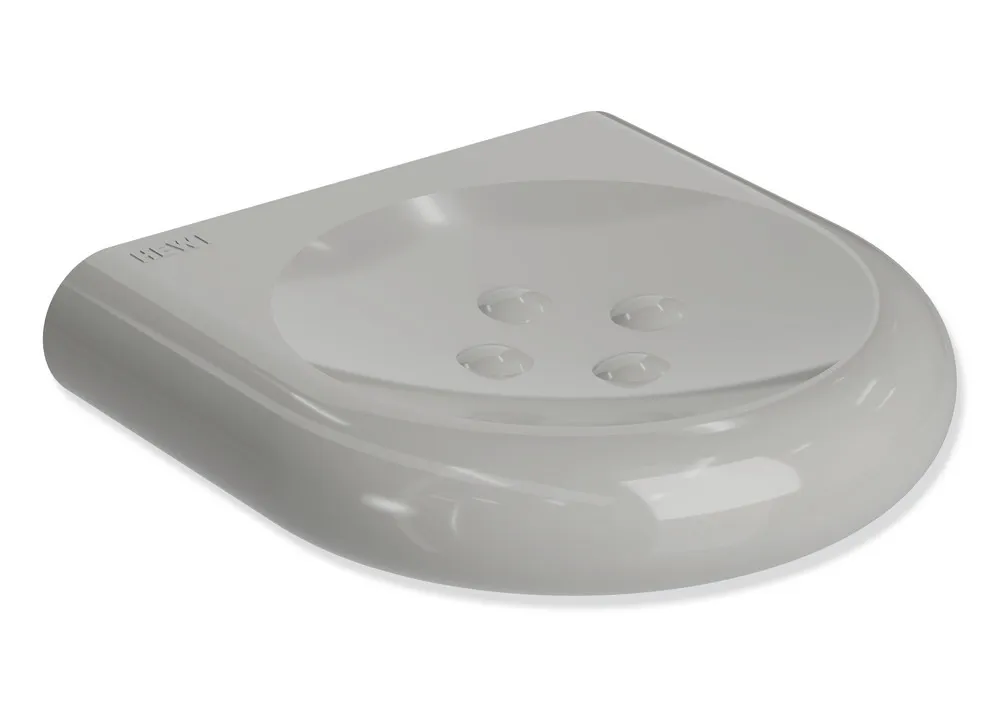 Seifenablage mit Noppen, eine Drucktaste ermöglicht das Abnehmen, diebstahlgeschützt durch Verriegelung, 120 mm breit, 25 mm hoch und 120 mm tief, aus hochwertigem Polyamid nach HEWI Farbtabelle, inklusive korrosionsfreiem HEWI Befestigungsmaterial.