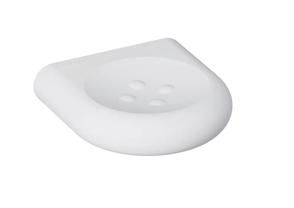 Seifenablage mit Noppen, eine Drucktaste ermöglicht das Abnehmen, diebstahlgeschützt durch Verriegelung, 98 mm breit, 25 mm hoch und 100 mm tief, aus hochwertigem, mattem Polyamid in den HEWI Farben 99 (Reinweiß), 98 (Signalweiß), 97 (Lichtgrau), 95 (Felsgrau) und 92 (Anthrazitgrau), inklusive korrosionsfreiem HEWI Befestigungsmaterial.