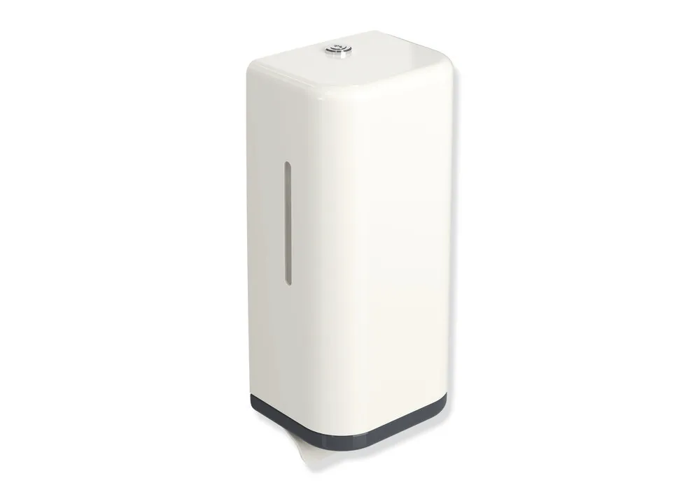 Korpus und Hebel aus hochglänzendem Polyamid in der HEWI Farbe 99 (Reinweiß), Rahmenelement aus hochglänzendem Polyamid, Füllmenge 600 ml, Breite 134 mm, Höhe 278 mm, Tiefe 106 mm.