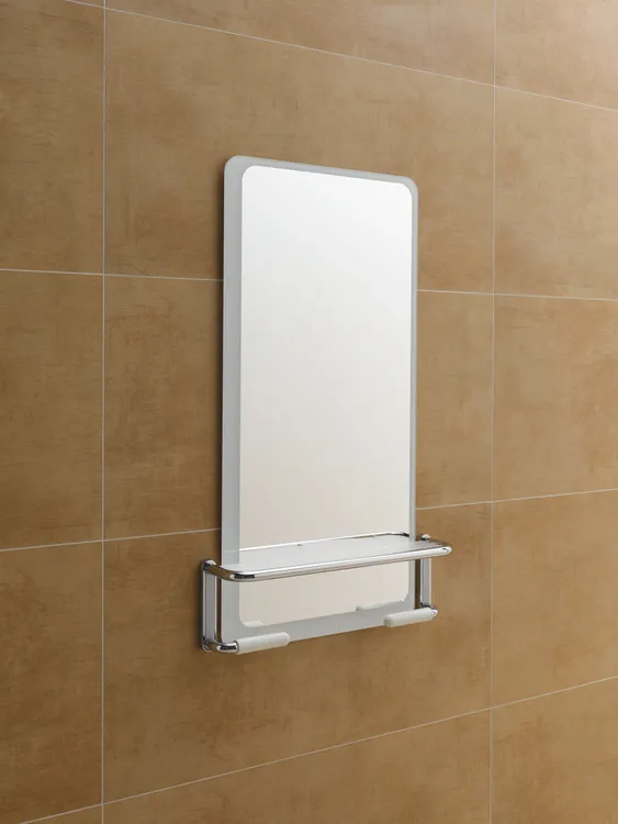 - verchromte Spiegelablage mit umlaufendem Rand und fest eingespannter, bruchsicherer Kunststoffplatte