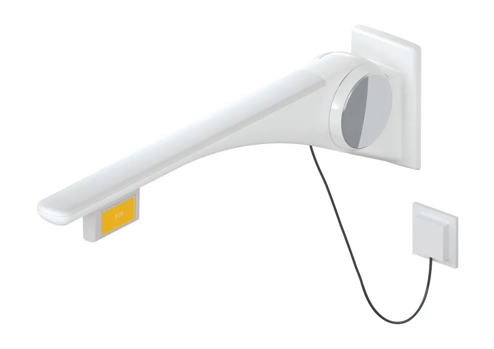 Mehr anzeigen Ausleger aus Aluminium, pulverbeschichtet, glänzend mit Griffpad aus Kunststoff, mit hochglänzend verchromten Designelementen, hochwertige Kunststoffoberfläche und kratzfeste Pulverbeschichtung, Ausladung 750 mm, mit Funktionstaste (E-Ausführung), Ausführung rechts, einfache Montage durch separate Installation der Montageplatte aus Edelstahl, matt geschliffen, getestet bis 150 kg bei Verwendung mit HEWI Befestigungsmaterial, empfohlenes maximales Gewicht des Anwenders: 150 kg, wird gemäß CE- und UKCA-Verordnung (EU) 2017/745 über Medizinprodukte produziert, erfüllt die in Belgien gültigen Anforderungen (CWATUPE, WVG Vlaanderen) hinsichtlich der Ausladung des Stützklappgriffes am WC.