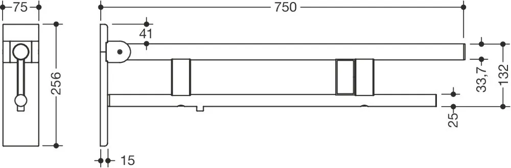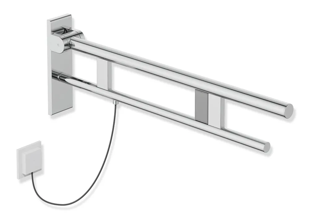 Edelstahl, verchromt, Ausladung 750 mm, mit Spül-/Funktionstasten (E-Ausführung), Ausführung rechts, getestet bis 150 kg bei Verwendung mit HEWI Befestigungsmaterial, empfohlenes maximales Gewicht des Anwenders: 150 kg, wird gemäß CE- und UKCA-Verordnung (EU) 2017/745 über Medizinprodukte produziert, erfüllt die in Belgien gültigen Anforderungen (CWATUPE, WVG Vlaanderen) hinsichtlich der Ausladung des Stützklappgriffes am WC.