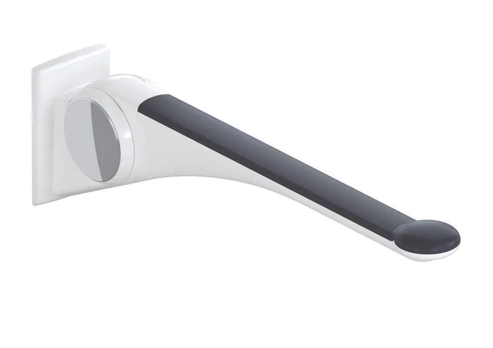 Ausleger aus Aluminium, pulverbeschichtet, glänzend mit Griffpad aus Kunststoff mit angepasstem erhabenem Griffendstück, mit hochglänzend verchromten Designelementen, hochwertige Kunststoffoberfläche und kratzfeste Pulverbeschichtung, Ausladung 600 mm, schnelle Montage durch einfaches Einhängen des Stützklappgriffs auf separat installierter Montageplatte aus Edelstahl, matt geschliffen, Rückenstütze 802.51.90..und Höhenverstellung 950.50.10260 nachrüstbar, getestet bis 150 kg bei Verwendung mit HEWI Befestigungsmaterial, empfohlenes maximales Gewicht des Anwenders: 150 kg, wird gemäß CE- und UKCA-Verordnung (EU) 2017/745 über Medizinprodukte produziert, erfüllt die Anforderungen nach DIN 18040.