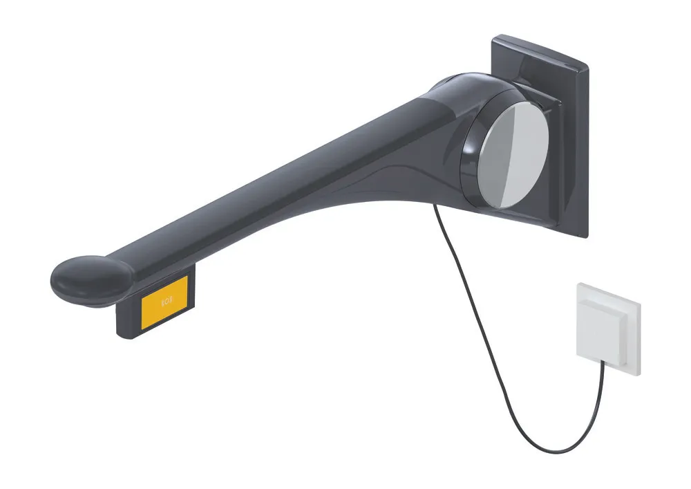 - Ausleger aus Aluminium, pulverbeschichtet in den HEWI Farben Signalweiß, glänzend mit Griffpad aus Kunststoff in SD (Signalweiß, matt) und GU (Anthrazit, matt) oder Ausleger Anthrazit, glänzend mit Griffpad in TB (Signalweiß, matt) und DR (Anthrazit, matt), mit hochglänzend verchromten Designelementen