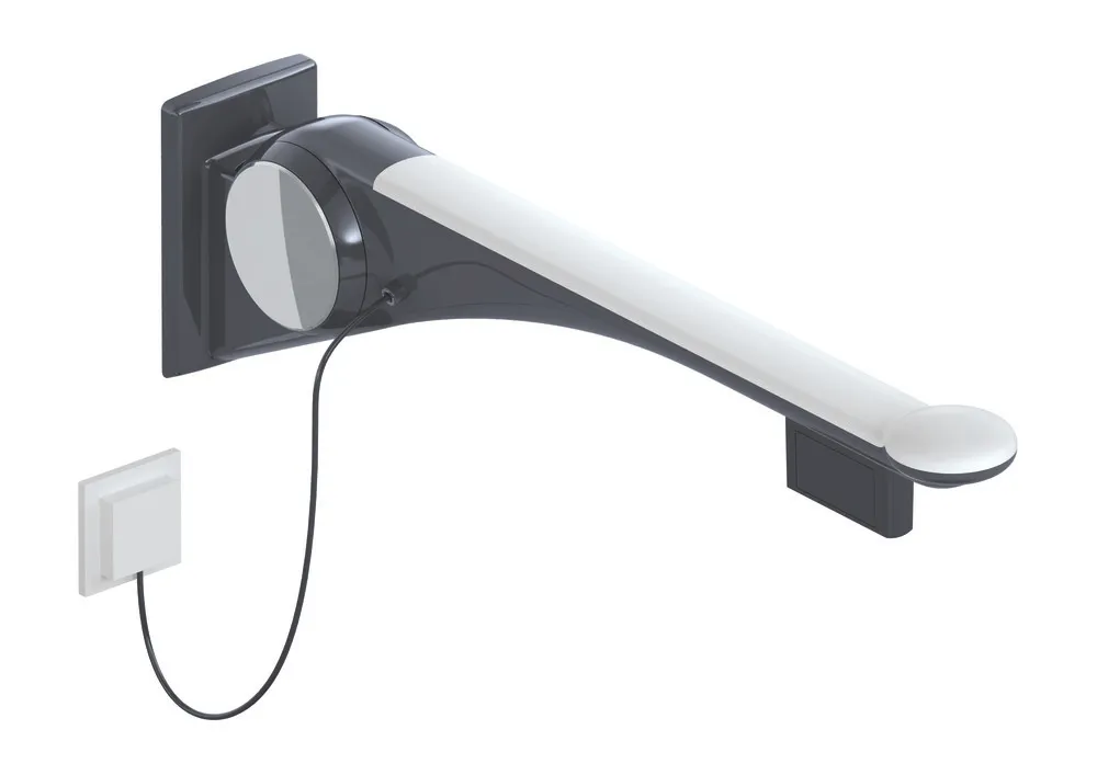 Mehr anzeigen Ausleger aus Aluminium, pulverbeschichtet, glänzend mit Griffpad aus Kunststoff mit angepasstem erhabenem Griffendstück, mit hochglänzend verchromten Designelementen, hochwertige Kunststoffoberfläche und kratzfeste Pulverbeschichtung, Ausladung 750 mm, mit Funktionstaste (E-Ausführung), Ausführung rechts, einfache Montage durch separate Installation der Montageplatte aus Edelstahl, matt geschliffen, getestet bis 150 kg bei Verwendung mit HEWI Befestigungsmaterial, empfohlenes maximales Gewicht des Anwenders: 150 kg, wird gemäß CE- und UKCA-Verordnung (EU) 2017/745 über Medizinprodukte produziert, erfüllt die in Belgien gültigen Anforderungen (CWATUPE, WVG Vlaanderen) hinsichtlich der Ausladung des Stützklappgriffes am WC.