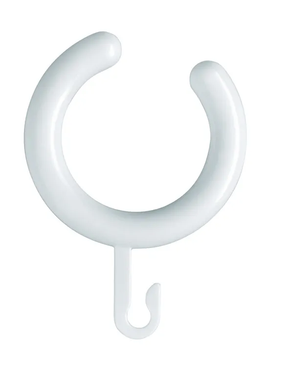 offene Ringe mit kleinen Haken zur Aufnahme eines Vorhanges, 60 mm im äußeren und 40 mm im inneren Durchmesser, 10 mm stark, aus hochwertigem Polyamid nach HEWI Farbtabelle, mit Ringenden aus POM, Verpackungseinheit 5 Stück.
