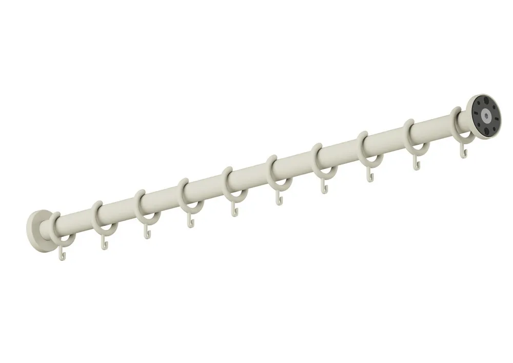 gerade Stange, mit Metallkern, Länge 1000 mm, mit 10 Vorhangringen, bauseits an Rosettenenden bis auf 200 mm kürzbar, Stangendurchmesser 33 mm, Rosettendurchmesser 70 mm, aus hochwertigem, mattem Polyamid in den HEWI Farben 99 (Reinweiß), 98 (Signalweiß), 97 (Lichtgrau), 95 (Felsgrau) und 92 (Anthrazitgrau),