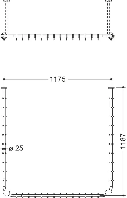 Mehr anzeigen waagerecht angeordnete, in rechten Winkeln U-förmig verbundene Stangen mit Vorhangringen, aus hochwertigem Edelstahl, matt geschliffen, für Duschwanne 1200 x 1200 mm, Achsmaß 1187 x 1175 x 1187 mm, mit 34 Vorhangringen aus weißem POM, empfohlene Vorhangbreite 5000 mm, Stangendurchmesser 25 mm, Rosettendurchmesser 70 mm, kann an den Enden bauseits bis auf 320 mm gekürzt werden, Befestigung mit Rosetten an Wand und Decke, Deckenabhängungen erforderlich (max. 600 mm lang), inklusive korrosionsfreiem HEWI Befestigungsmaterial.