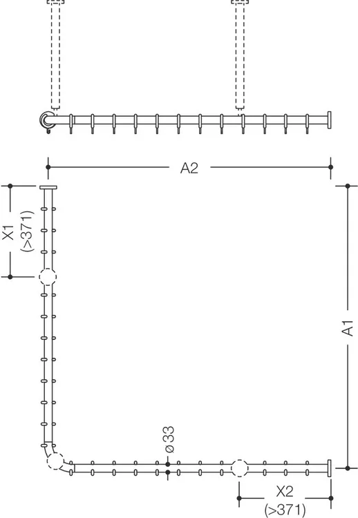 Mehr anzeigen waagerecht angeordnete, im rechten Winkel verbundene Stangen mit Vorhangringen, mit Metallkern, Befestigung mit Rosetten an Wand und Decke, Deckenabhängungen erforderlich, mit entsprechender Anzahl Vorhangringe, Schenkellängen A1/A2 auf Maß gefertigt von 220 mm bis 3383 mm, Stangendurchmesser 33 mm, Rosettendurchmesser 70 mm, mit Vorbereitung für Deckenabhängung im Bogen und zusätzlich auf einem oder beiden Schenkeln A1/A2, aus hochwertigem Polyamid nach HEWI Farbtabelle.