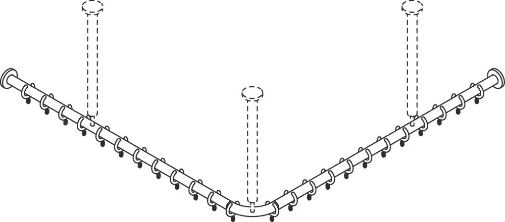 waagerecht angeordnete, im rechten Winkel verbundene Stangen mit Vorhangringen, mit Metallkern, Befestigung mit Rosetten an Wand und Decke, Deckenabhängungen erforderlich, mit entsprechender Anzahl Vorhangringe, Schenkellängen A1/A2 auf Maß gefertigt von 220 mm bis 3383 mm, Stangendurchmesser 33 mm, Rosettendurchmesser 70 mm, mit Vorbereitung für Deckenabhängung im Bogen und zusätzlich auf einem oder beiden Schenkeln A1/A2, aus hochwertigem Polyamid nach HEWI Farbtabelle.