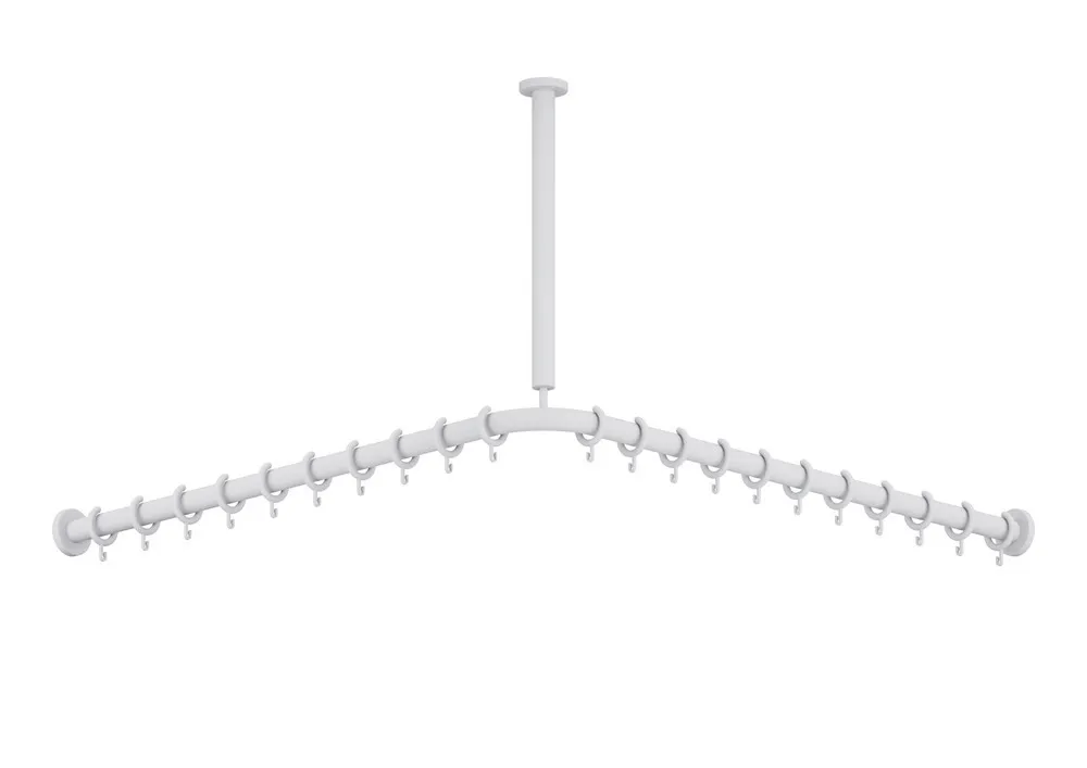 Mehr anzeigen waagerecht angeordnete, im rechten Winkel verbundene Stangen, mit Metallkern, Länge auf Maß gefertigt von 220 mm bis max. 1983 mm, bauseits an Rosettenenden kürzbar, mit entsprechender Anzahl Vorhangringen aus Polyamid, Stangendurchmesser 33 mm, Rosettendurchmesser 70 mm, aus hochwertigem, mattem Polyamid in den HEWI Farben 99 (Reinweiß), 98 (Signalweiß), 97 (Lichtgrau), 95 (Felsgrau) und 92 (Anthrazitgrau),