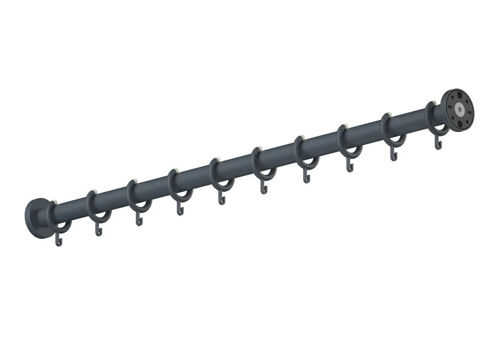 Stange mit Vorhangringen, mit Metallkern, mit entsprechender Anzahl Vorhangringe, Länge auf Maß gefertigt von min. 1701 mm bis max. 3400 mm, Stangendurchmesser 33 mm und Rosettendurchmesser 70 mm, aus hochwertigem, mattem Polyamid in den HEWI Farben 99 (Reinweiß), 98 (Signalweiß), 97 (Lichtgrau), 95 (Felsgrau) und 92 (Anthrazitgrau)