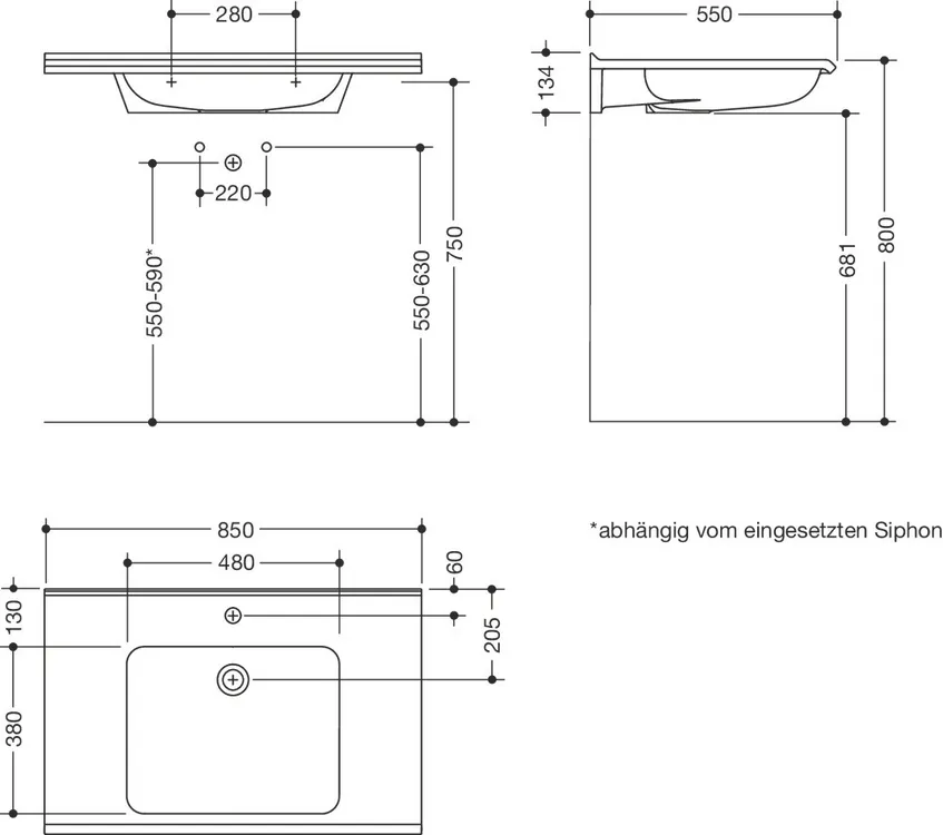 Mineralguss, alpinweiß, mit Ablagefläche und tiefem rechteckigem Becken, adaptive Zusatzfunktionen erweiter- und rückbaubar, 850 mm breit und 550 mm tief, Waschmuldentiefe 100 mm, ohne Überlauf, mit Schwallkante zur Wand, für Einlocharmatur vorgerichtet, unterfahrbar nach DIN 18040 und ÖNORM B1600/1601, belastbar nach DIN EN 14688, CE-Kennzeichnung nach Bauprodukteverordnung Nr. 305/2011.