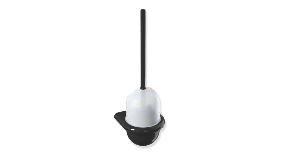Bürstengriff mit auswechselbarem schwarzem Bürstenkopf aus Polyamid, Bürstentopf mit gewölbtem Boden und sphärenförmigem, teilweise offenem Oberteil in ringförmigem Halter, der Behälter ist herausnehmbar, kann aber auch diebstahlgeschützt montiert werden, diebstahlgeschützt durch verdeckte Verschraubung, 141 mm breit, 470 mm hoch und 140 mm tief, Halter, Bürstentopf und Bürstengriff aus hochwertigem Polyamid nach HEWI Farbtabelle, Oberteil aus transluzentem Kunststoff in Farbe weiß, inklusive korrosionsfreiem HEWI Befestigungsmaterial.